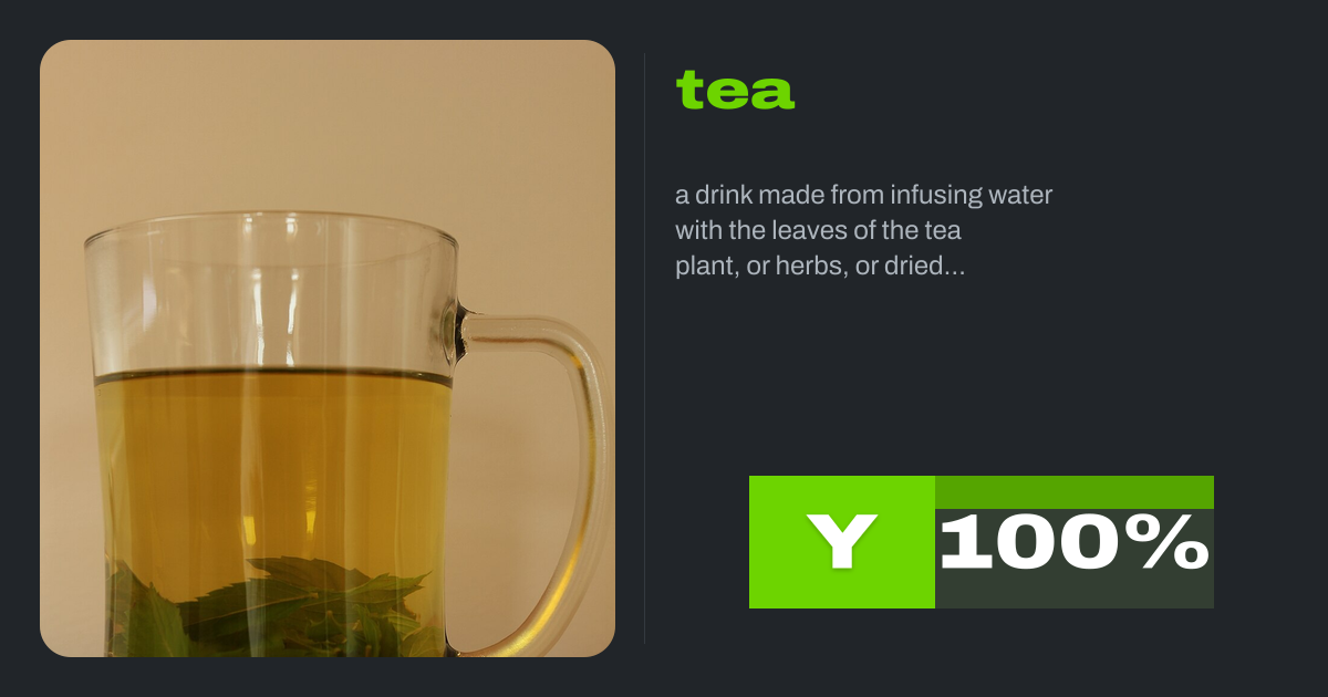 a drink made from infusing water with the leaves of the tea plant, or herbs, or dried fruits, or other plants, etc.; represents a wider use of the term "tea" and subsumes all kinds of infusions, e.g. black tea, herbal tea, fruit tea etc.