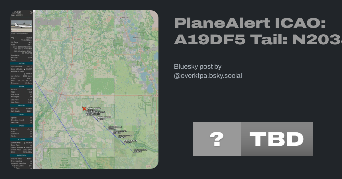PlaneAlert ICAO: A19DF5 Tail: N203JE Flt: N203JE