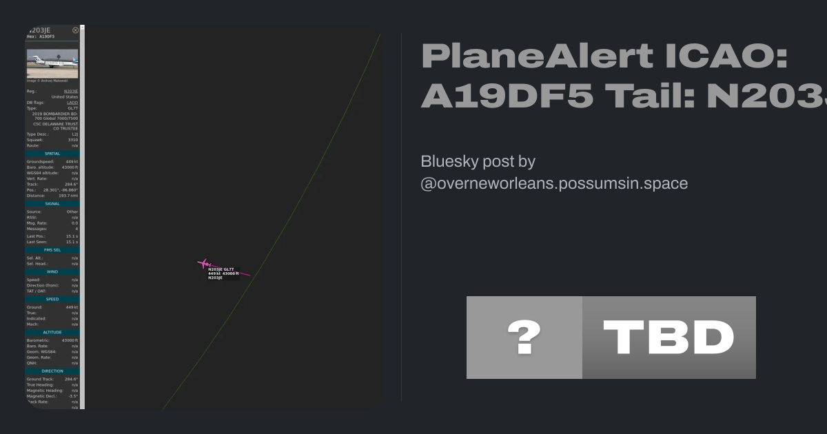 PlaneAlert ICAO: A19DF5 Tail: N203JE Flt: N203JE