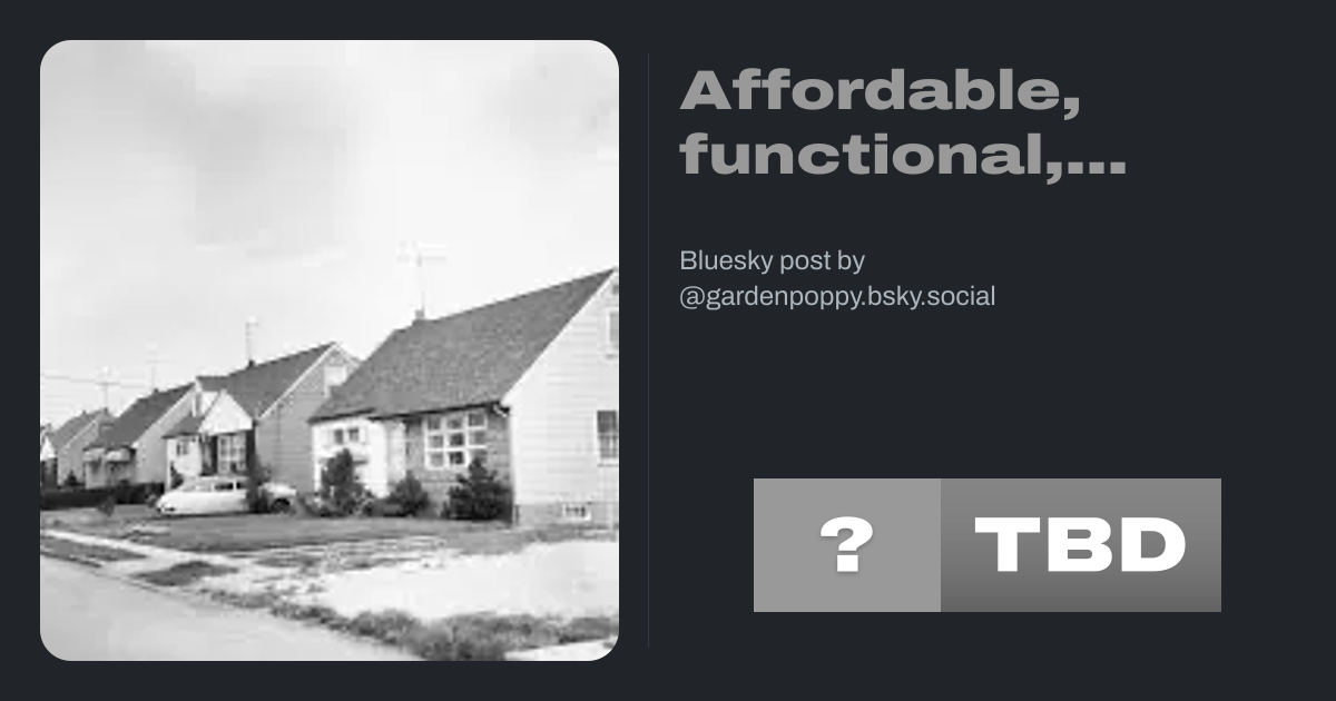 Affordable, functional, utilitarian houses for everyone. Levittown, NY built after WWII for families who needed affordable housing. Bought farm land, changed zoning laws to allow small blueprint and simple construction. $0 down loans with mortgage same as rent. en.wikipedia.org/w...
