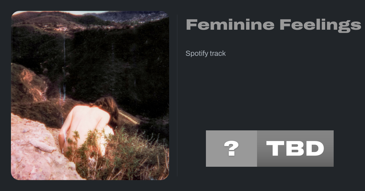 I’m currently playing "Feminine Feelings" by Chrissy at April 12, 2026 at 06:57AM