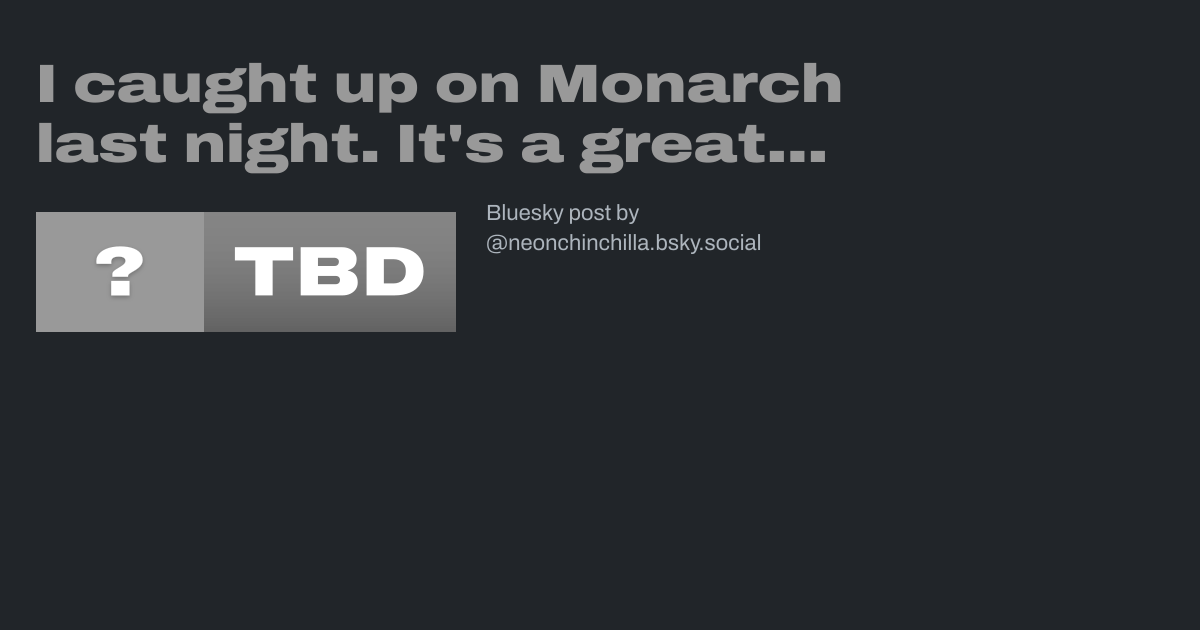 I caught up on Monarch last night. It's a great show. Oddly though I need to be in the mood for it. Which is a weird thing.