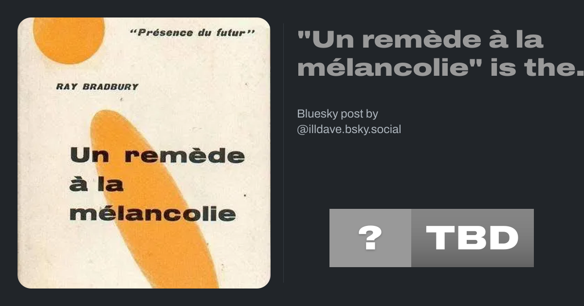 "Un remède à la mélancolie" is the French name for A Medicine for Melancholy, the 1959 collection of short science fiction fantasy stories by Ray Bradbury. This is the 1961 paperback edition.