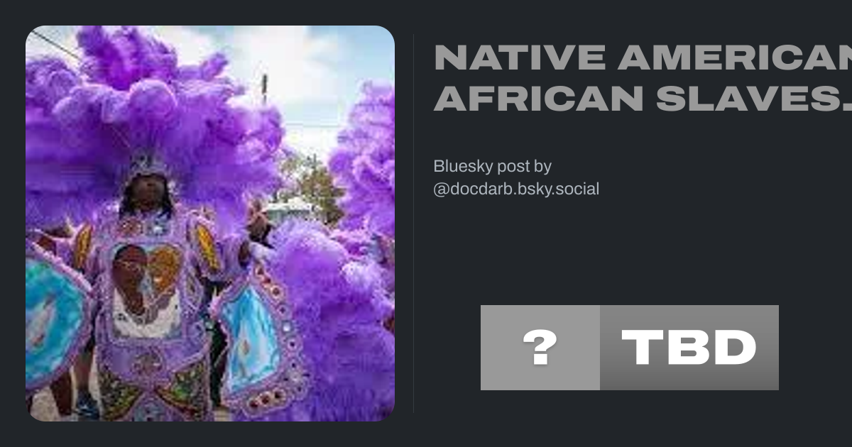 NATIVE AMERICANS HID AFRICAN SLAVES CELEBRATED EVERY MARTIGRAS African Indian Mardi Gras costumes (or Black Masking Indian suits) originated in 18th-19th century New Orleans as a tribute to Native Americans who sheltered escaped enslaved Africans. en.wikipedia.org/wiki/Mardi_G...