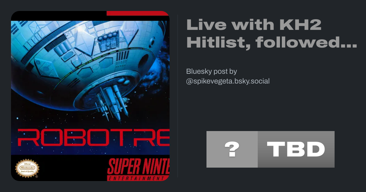 Live with KH2 Hitlist, followed by !SNESMania Game 466: Robotrek, Day 1! twitch.tv/spikevegeta
