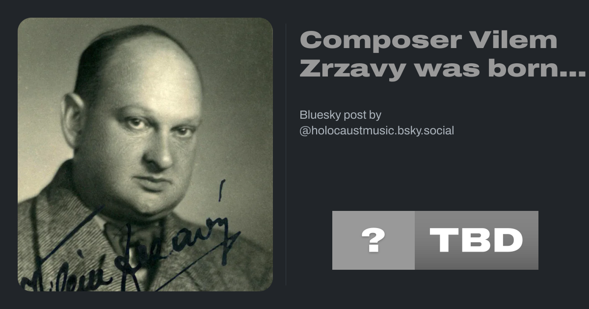 Composer Vilem Zrzavy was born #OTD 1895. On Dec 10 1941 he was deported to Terezin. He is known to have composed "V'liy'rushalayim" for string quartet and voice. On 28 Apr 1942 he and his wife were transferred to Zamoschsche, where they died.