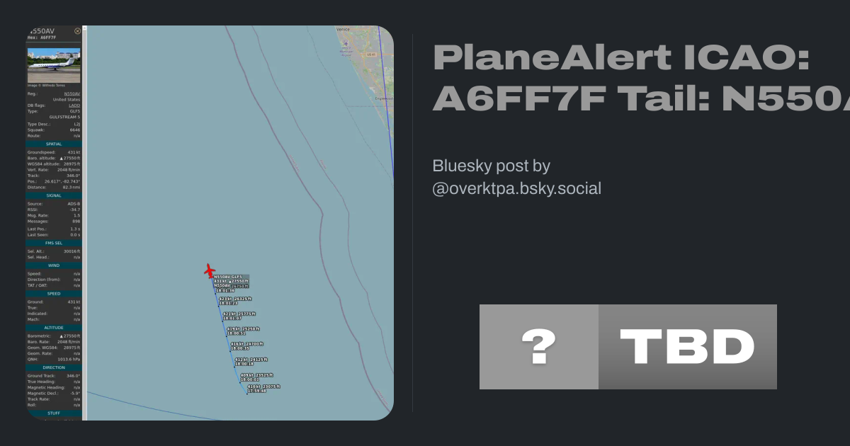 PlaneAlert ICAO: A6FF7F Tail: N550AV Flt: N550AV