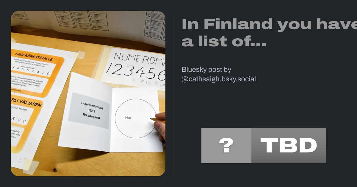 In Finland you have a list of candidates with numbers in the booth. And then you write the number on the ballot. Counting the votes is a bit more complicated, D'Hondt method if you want to read, but the voting itself is real simple. en.wikipedia.org/wiki/D%27Hon...