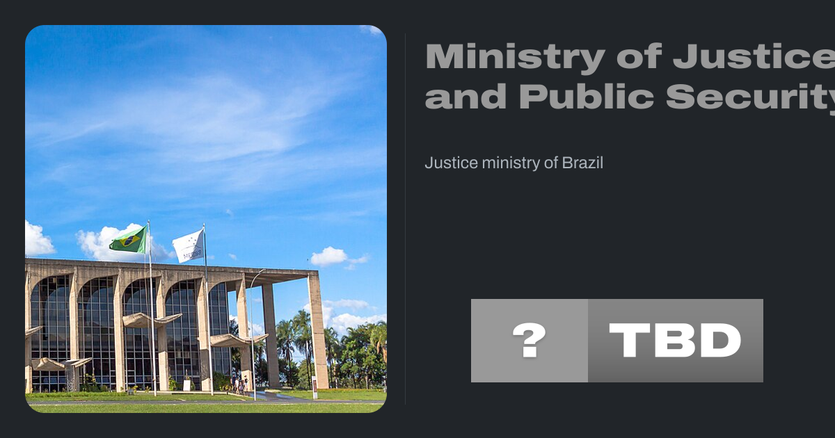 The Ministry of Justice and Public Security (Portuguese: Ministério da Justiça e Segurança Pública), previously known as Ministry of Justice (Portuguese: Ministério da Justiça) and Ministry of Justice and Citizenship (Portuguese: Ministério da Justiça e Cidadania), is a cabinet-level federal ministry in Brazil. The current minister is Ricardo...