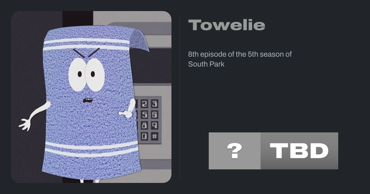 "Towelie" is the eighth episode of the fifth season of the American adult animated sitcom South Park, and the 73rd episode of the series overall. It originally aired on Comedy Central in the United States on August 8, 2001. In the episode, the boys attempt to recover their stolen video game console from the middle of a feud between a...