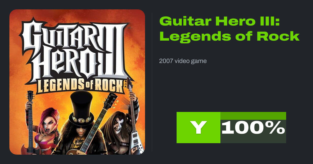 Guitar Hero III: Legends of Rock is a 2007 rhythm game developed by Neversoft and published by Activision. It is the third main installment and the fourth overall installment in the Guitar Hero series. It is the first game in the series to be developed by Neversoft after Activision's acquisition of RedOctane and MTV Games' purchase of Harmonix,...