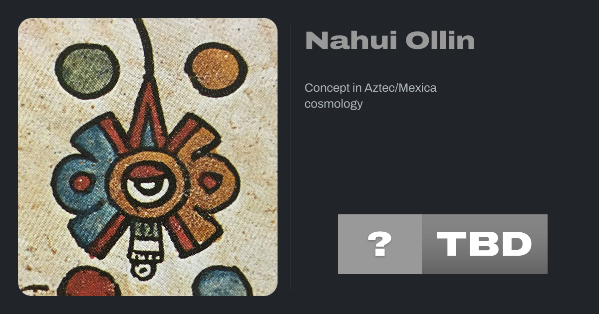 Nahui Ollin is a concept in Aztec/Mexica cosmology with a variety of meanings. Nahui translates to "four," and Ollin translates to "movement" or "motion." Ollin was primarily portrayed in Aztec codices as two interlaced lines, each portrayed with two central ends. Nahui Ollin has been used as an educational framework, particularly in social...