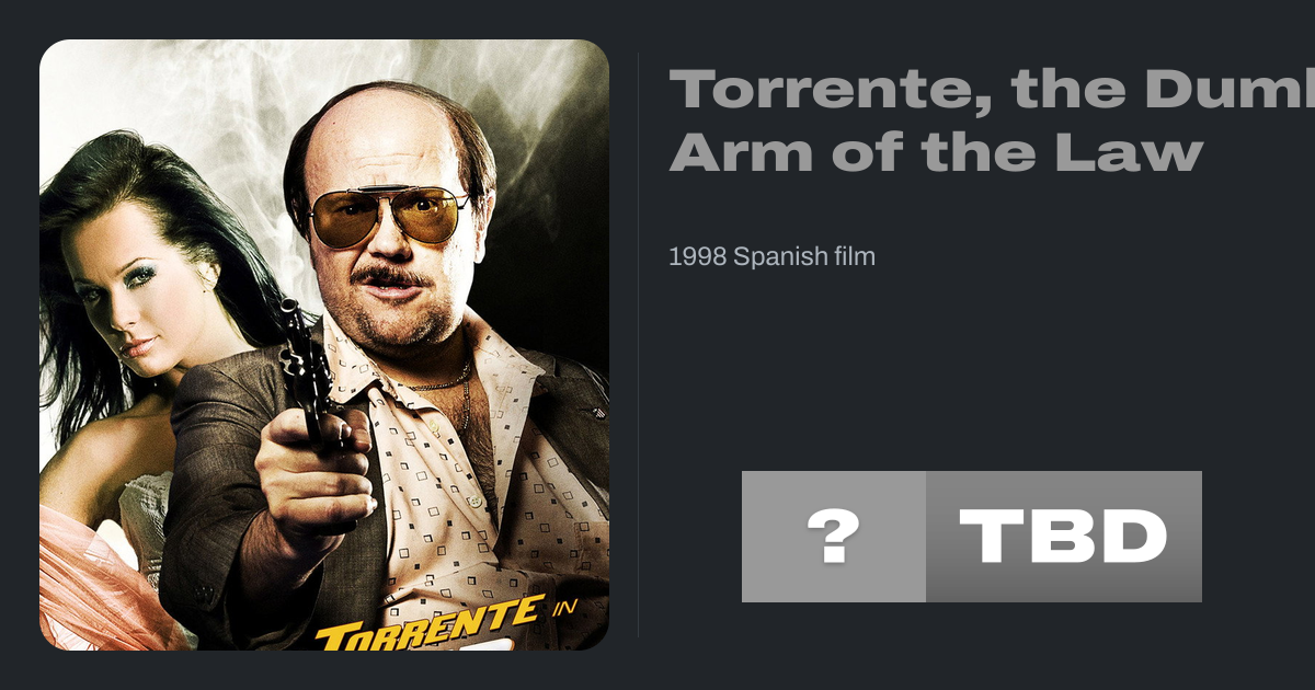 Torrente, the Dumb Arm of the Law (Spanish: Torrente, el brazo tonto de la ley) is a 1998 Spanish dark comedy film written and directed by Santiago Segura, who stars as José Luis Torrente, a racist, sexist, homophobic, xenophobic, and fascist former police agent. Characterized by its deliberately cartoonish humor, it proved to be a massive box...