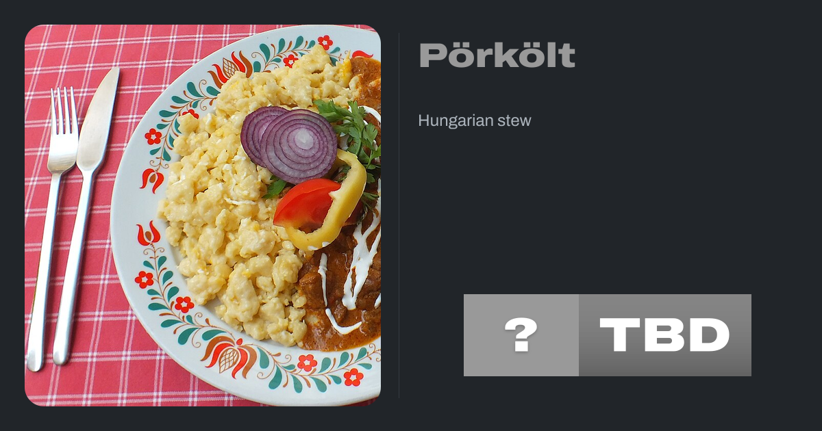 Pörkölt (Hungarian: [ˈpørkølt]) is a meat stew which originates from Hungary, however is eaten throughout Central Europe.