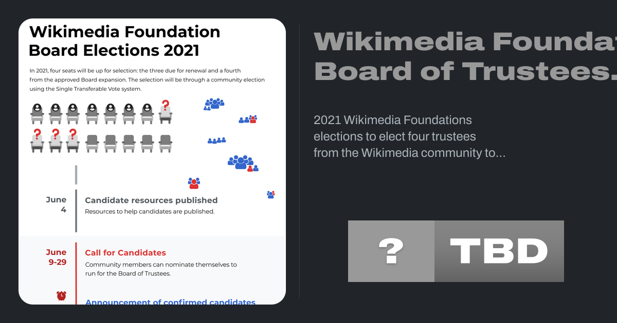 2021 Wikimedia Foundations elections to elect four trustees from the Wikimedia community to the Board.