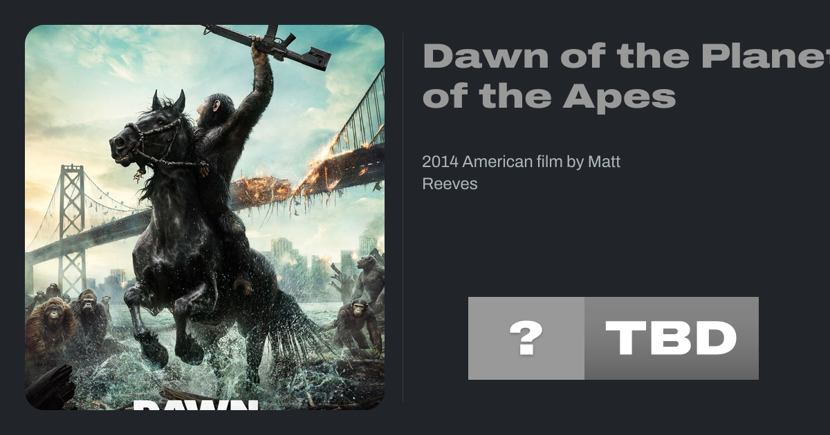 Dawn of the Planet of the Apes is a 2014 American science fiction action film directed by Matt Reeves and written by Mark Bomback and the writing team of Rick Jaffa and Amanda Silver. The sequel to Rise of the Planet of the Apes (2011), it is the second installment in the Planet of the Apes reboot film series and the eighth film overall. It...