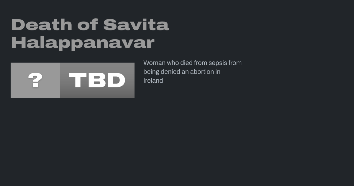 Savita Halappanavar (née Savita Andanappa Yalagi; 9 September 1981 – 28 October 2012) was a dentist of Indian origin, living in Ireland, who died from sepsis after her request for an abortion after a prolonged miscarriage was denied on legal grounds. In the wake of a nationwide outcry over her death, Irish voters passed in a landslide the...
