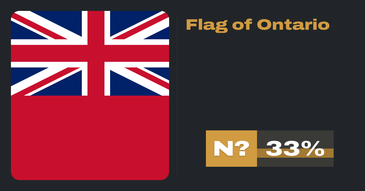 The flag of Ontario is a defaced Red Ensign, with the Royal Union Flag in the canton and the Ontario shield of arms in the fly. The flag of Ontario was derived from the Canadian Red Ensign, which was used as a civil ensign and as a de facto flag of Canada from the late 19th century to 1965. It was adopted in a period when many Canadian provinces...