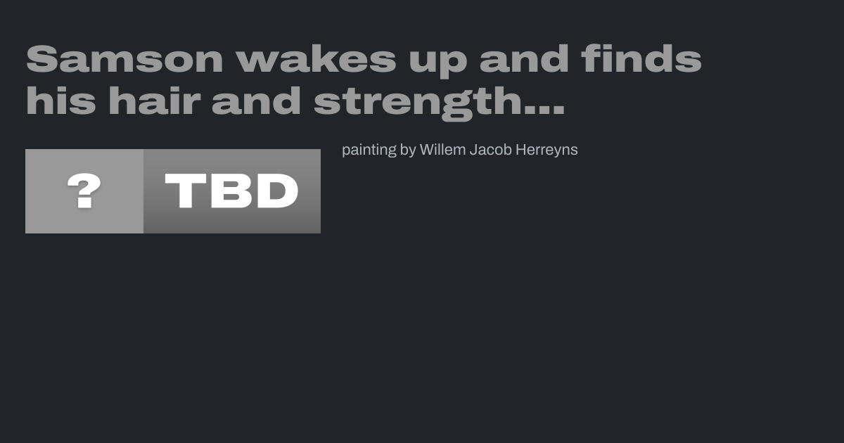 Samson wakes up and finds his hair and strength gone; he is taken prisoner by the Philistines (Judges 16:20)