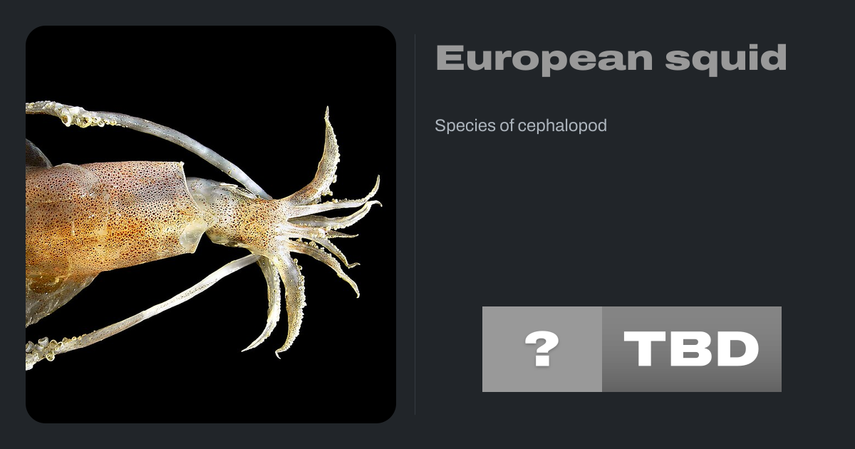 The European squid or common squid (Loligo vulgaris) is a large squid belonging to the family Loliginidae. It occurs abundantly in coastal waters from the North Sea to at least the west coast of Africa. This species lives from sea level to depths of 500 m (1,600 ft). Its mantle is up to 40 cm (16 in) long. The species is extensively exploited by...