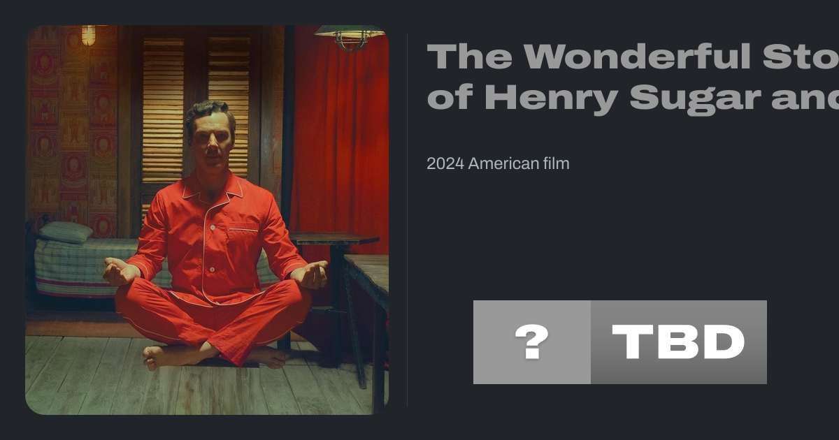 The Wonderful Story of Henry Sugar and Three More is a 2024 American fantasy anthology film written, directed and co-produced by Wes Anderson, based on four short stories by Roald Dahl. This is the second film adaptation of a Dahl work directed by Anderson, following Fantastic Mr. Fox (2009). It stars Benedict Cumberbatch, Ralph Fiennes, Dev...