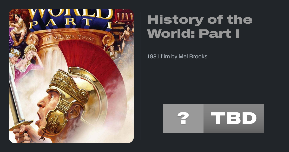 History of the World, Part I is a 1981 American comedy film written, produced, and directed by Mel Brooks. Brooks also stars in the film, playing five roles: Moses, Comicus the stand-up philosopher, Tomás de Torquemada, King Louis XVI, and Jacques, le garçon de pisse. The large ensemble cast also features Sid Caesar, Shecky Greene, Gregory...
