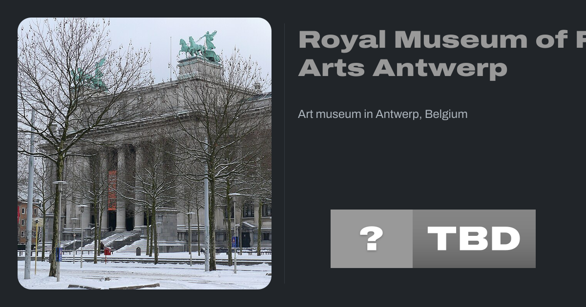 The Royal Museum of Fine Arts Antwerp (Dutch: Koninklijk Museum voor Schone Kunsten Antwerpen; KMSKA) is a museum in Antwerp, Belgium, founded in 1810, that houses a collection of paintings, sculptures and drawings from the fourteenth to the twentieth centuries. This collection is representative of the artistic production and the taste of art...