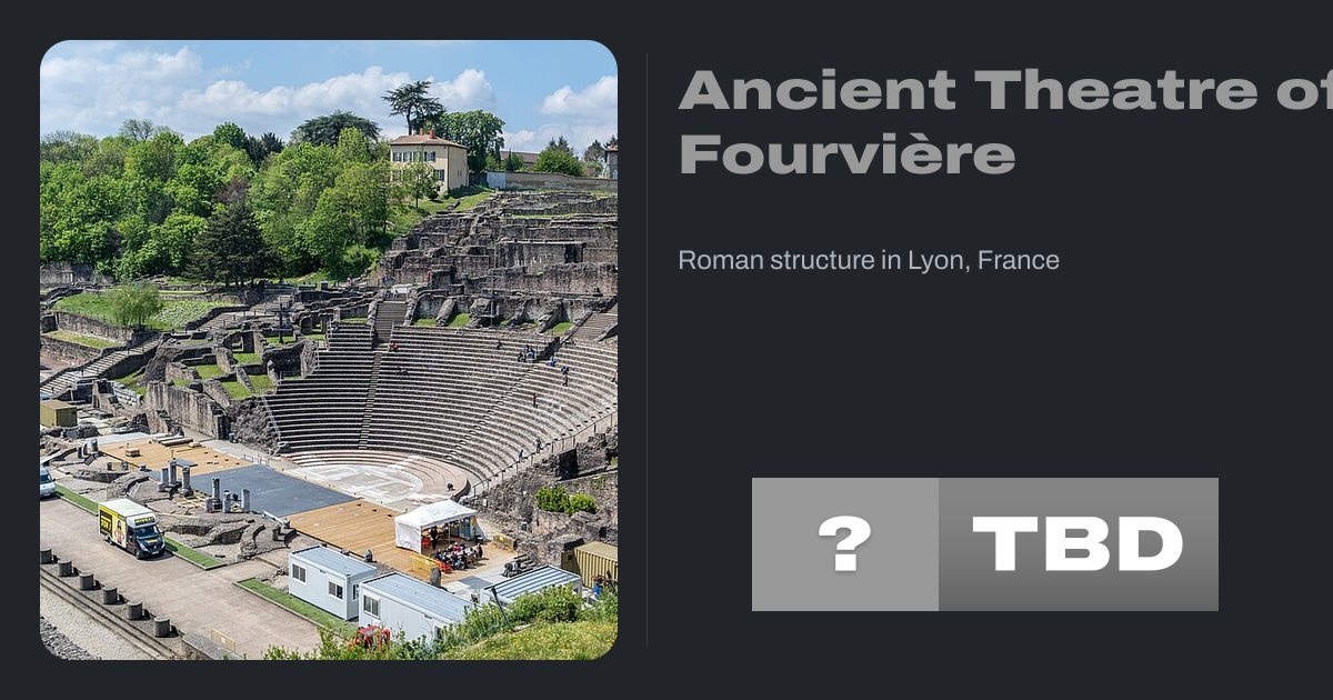 The Ancient Theatre of Fourvière (French: Théâtre antique de Lyon) is a Roman theatre in Lyon, France. It was built on the hill of Fourvière, which is situated in the center of the Roman city. The theatre is part of a UNESCO World Heritage Site that protects the historic center of Lyon.