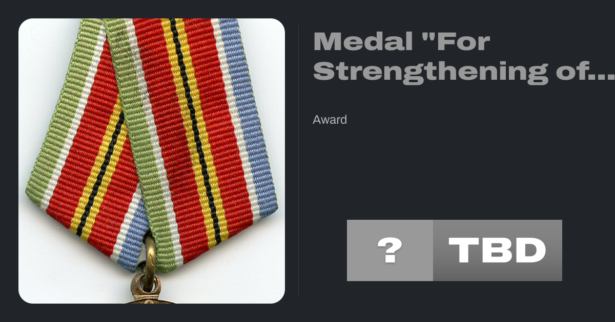 The Medal "For Strengthening Military Cooperation" (Russian: Медаль «За укрепление боевого содружества») was a military award of the Soviet Union established on May 25, 1979, by Decree of the Presidium of the Supreme Soviet. Its statute was later confirmed and slightly amended by Decree of the Presidium of the Supreme Soviet No. 2523-X of July...
