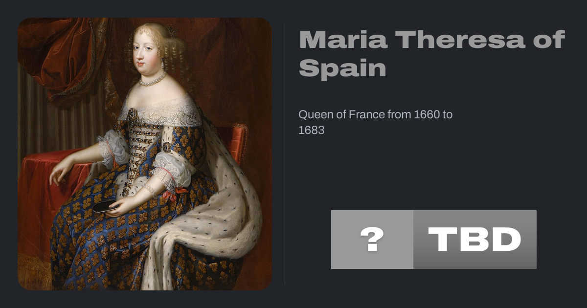 Maria Theresa of Spain (Spanish: MarÃa Teresa de Austria; French: Marie-Thérèse d'Autriche; 10 September 1638 – 30 July 1683) was Queen of France from 1660 to 1683 as the wife of King Louis XIV. She was born an Infanta of Spain and Portugal as the daughter of King Philip IV and Elisabeth of France, and was also an Archduchess of Austria as a...