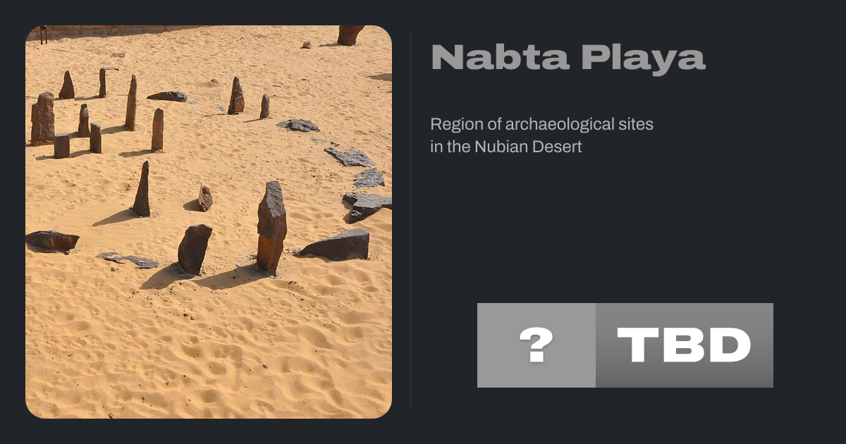 Nabta Playa was once a large endorheic basin (a temporary lake, or "playa") in the Nubian Desert, located approximately 800 kilometers south of modern-day Cairo or about 100 kilometers west of Abu Simbel in southern Egypt, 22.51° north, 30.73° east. Today the region is characterized by numerous archaeological sites. The Nabta Playa...