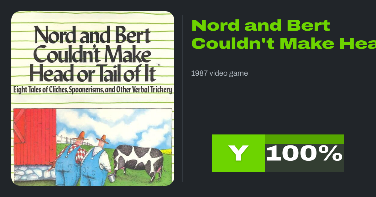 Nord and Bert Couldn't Make Head or Tail of It is an interactive fiction video game written by Jeff O'Neill and published by Infocom in 1987. It was released simultaneously for MS-DOS, Commodore 64, and other platforms. Nord and Bert was unique among Infocom games in that it used the game engine to present wordplay puzzles rather than an...