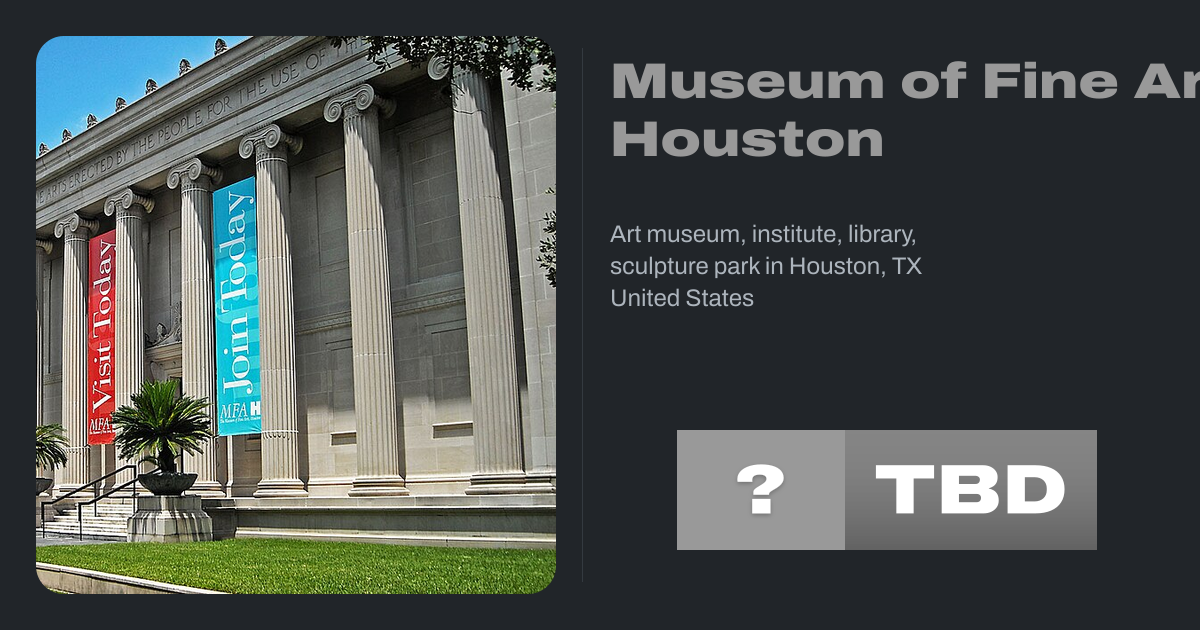 The Museum of Fine Arts, Houston (MFAH), is an art museum located in the Houston Museum District of Houston, Texas. The permanent collection of the museum spans more than 5,000 years of history with nearly 80,000 works from six continents. By gallery space, it is the second-largest art museum in the Americas. Following an eight-year campus...