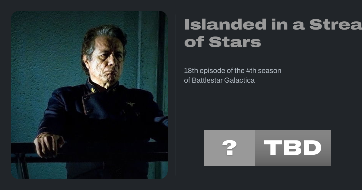 "Islanded in a Stream of Stars" is the eighteenth episode in the fourth season of the reimagined Battlestar Galactica. It aired on television in the United States and Canada on March 6, 2009. The survivor count shown in the title sequence is 39,521. The Region 1 DVD release of Season 4.5 includes an extended version of this episode.