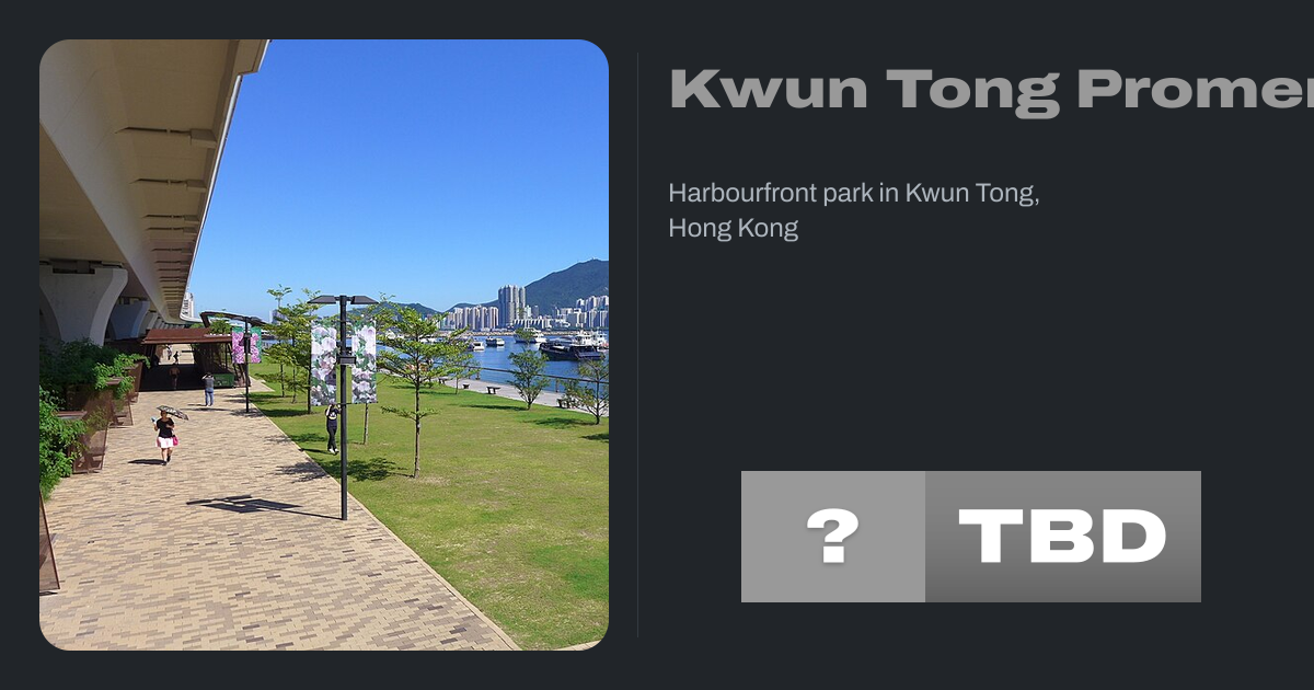 Kwun Tong Promenade is an urban waterfront park in Kwun Tong, New Kowloon, Hong Kong. The first and second stages of the promenade, opened in 2010 and 2015 respectively, comprise the first open space project of the Kai Tak Development. The promenade is about one kilometre in length. It overlooks the Kwun Tong Typhoon Shelter and sits beneath the...