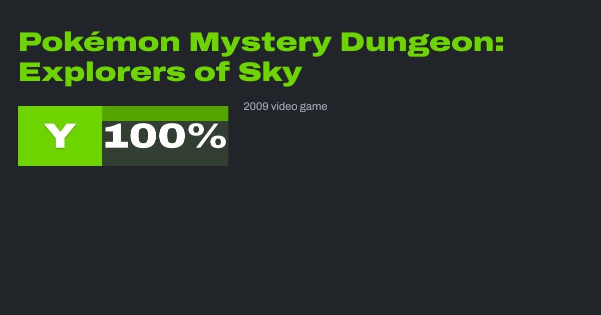 Pokémon Mystery Dungeon: Explorers of Sky is an enhanced version of Pokémon Mystery Dungeon: Explorers of Time and Explorers of Darkness released for the Nintendo DS in 2009, developed by Chunsoft and published by The Pokémon Company and Nintendo. As a sister game, and sometimes referred to as the definitive edition to the aforementioned games,...