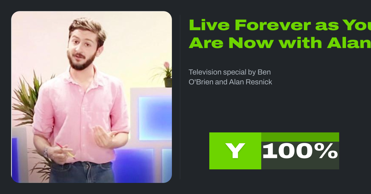Live Forever as You Are Now with Alan Resnick is a television special written, created and directed by Alan Resnick and Ben O'Brien for Adult Swim, as part of the Infomercials series. The special is presented as a parody of self-help infomercials, advertising a four-step program for creating a digital avatar that acts as a backup of its host....