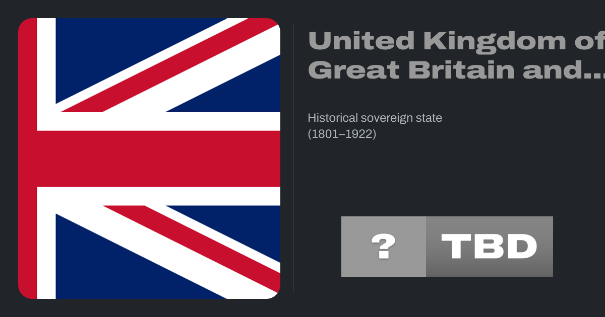 The United Kingdom of Great Britain and Ireland was a sovereign state in Northwestern Europe that was established by the union in 1801 of the Kingdom of Great Britain and the Kingdom of Ireland. The establishment of the Irish Free State in 1922 led to the remainder later being renamed the United Kingdom of Great Britain and Northern Ireland in...