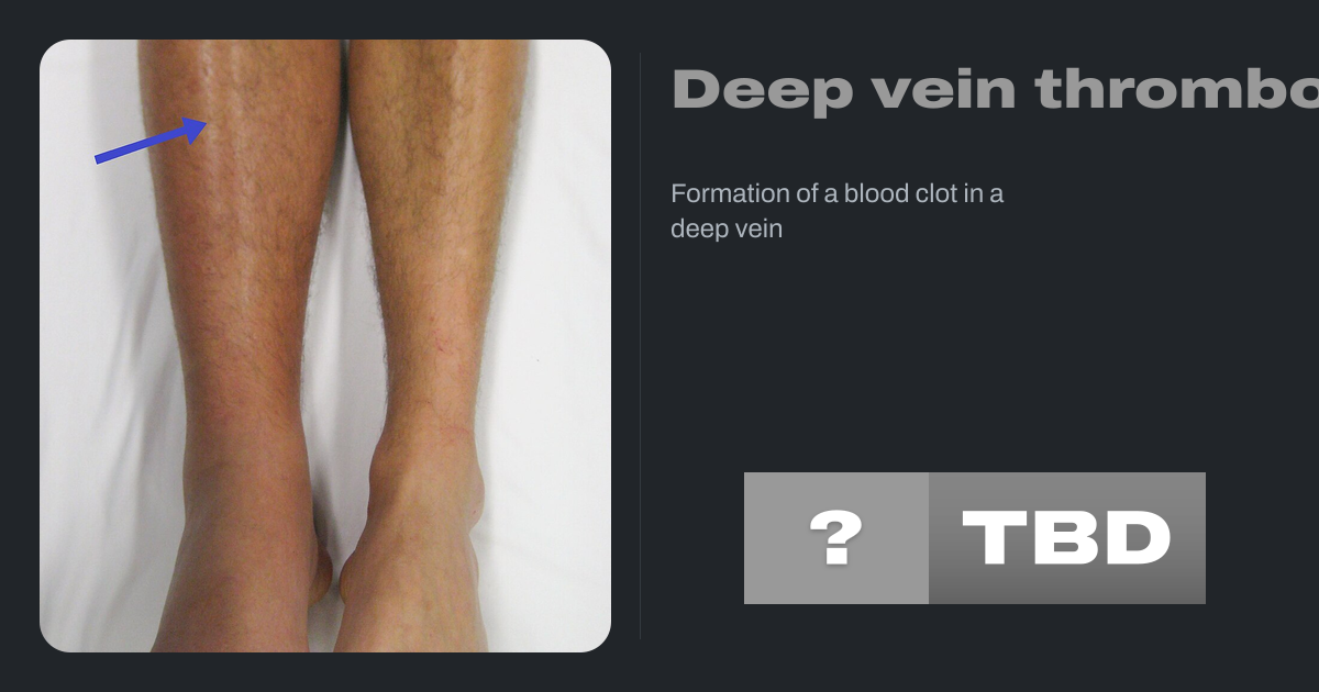 Deep vein thrombosis (DVT) is a type of venous thrombosis involving the formation of a blood clot in a deep vein, most commonly in the legs or pelvis. A minority of DVTs occur in the arms. Symptoms can include pain, swelling, redness, and enlarged veins in the affected area, but some DVTs have no symptoms.