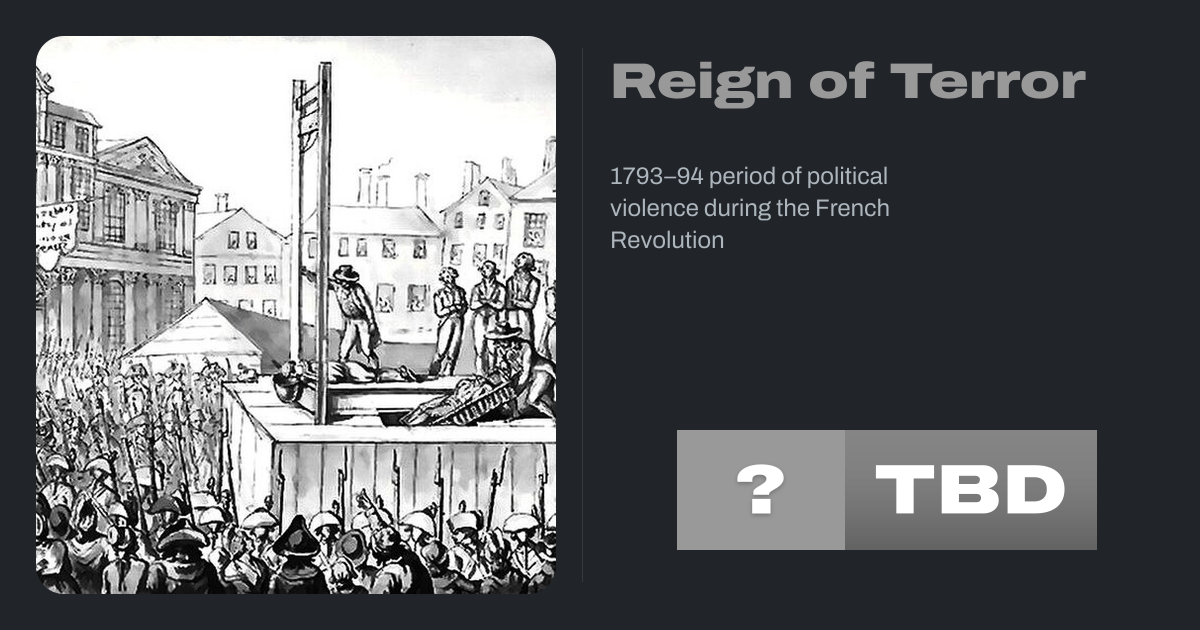The Reign of Terror (French: La Terreur, lit. 'The Terror') was a period of the French Revolution when, following the creation of the First Republic, a series of massacres and numerous public executions took place in response to the Federalist revolts, revolutionary fervour, anticlerical sentiment, and accusations of treason by the Committee of...