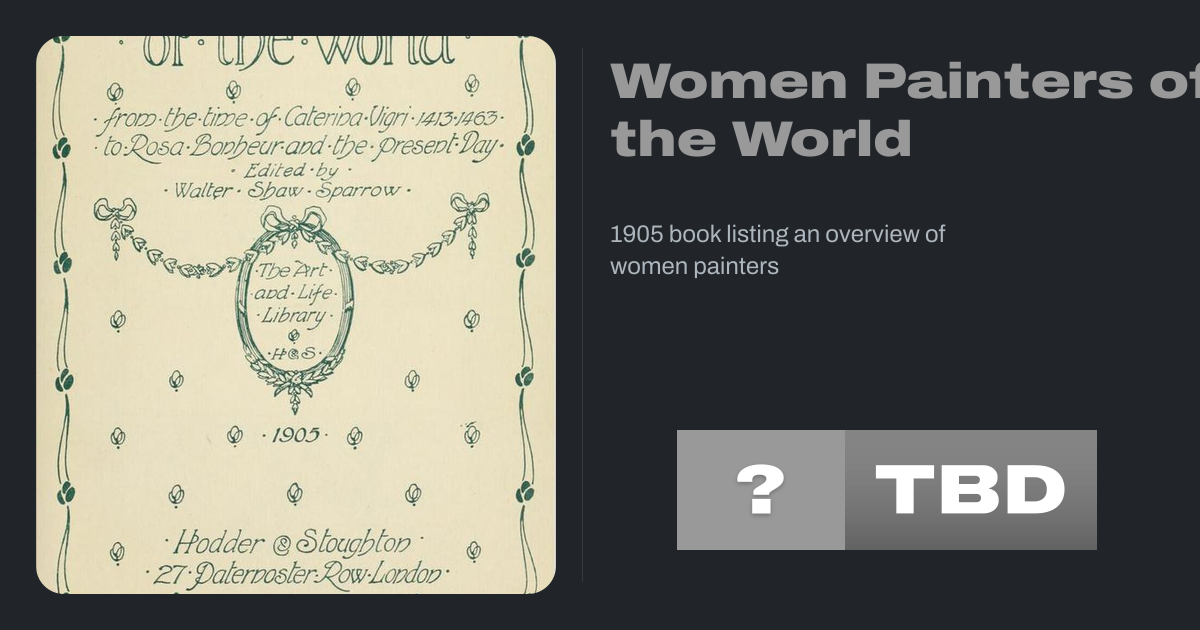 Women Painters of the World, from the time of Caterina Vigri, 1413–1463, to Rosa Bonheur and the present day, assembled and edited by Walter Shaw Sparrow, is a book that lists an overview of prominent women painters up to 1905, the year of publication.