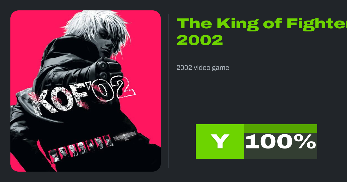 The King of Fighters 2002: Challenge to Ultimate Battle (KOF 2002, or KOF '02) is a fighting game developed by Eolith and published by Eolith and Playmore for the Neo Geo in 2002. It is the ninth game in The King of Fighters series and the second one to be produced by Eolith. The game was ported to the Dreamcast, PlayStation 2, and the Xbox,...
