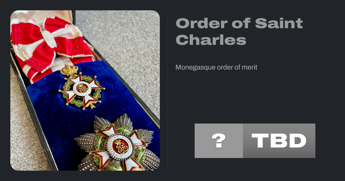 The Order of Saint Charles (French: Ordre de Saint-Charles; Monégasque: U̍rdine de San Carlu) is a dynastic order of knighthood established in Monaco on 15 March 1858.