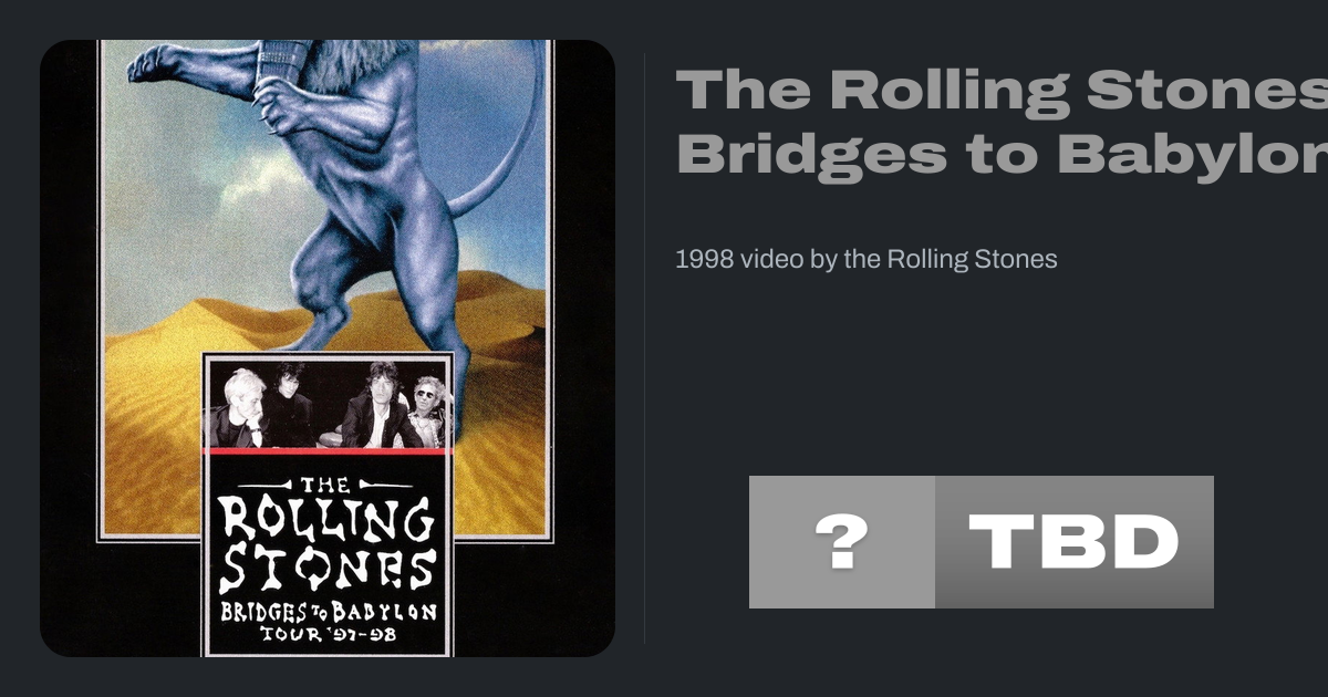 Bridges to Babylon Tour '97โ98 by the Rolling Stones is a concert DVD released in December 1998. It was filmed in the TWA Dome in St. Louis, Missouri on 12 December 1997 during the Bridges to Babylon Tour 1997โ1998. Featuring performances by Dave Matthews and Joshua Redman.