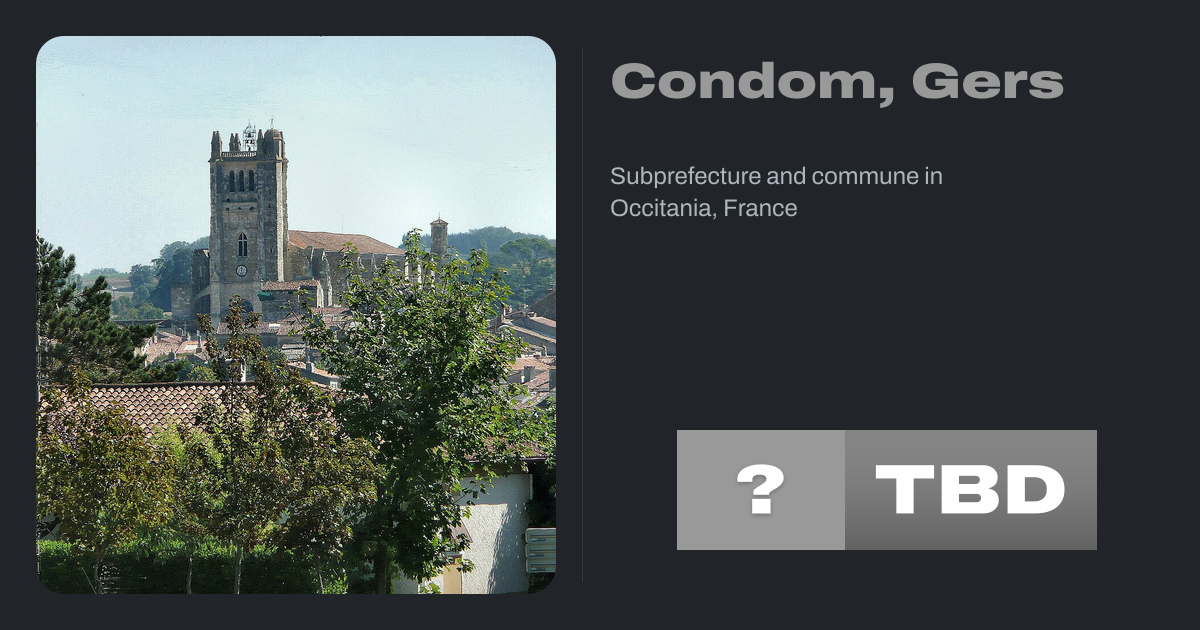 Condom (Occitan: Condòm; French pronunciation: [kɔ̃dɔ̃]), also known as Condom-en-Armagnac, is a commune in southwestern France in the department of Gers, of which it is a subprefecture.