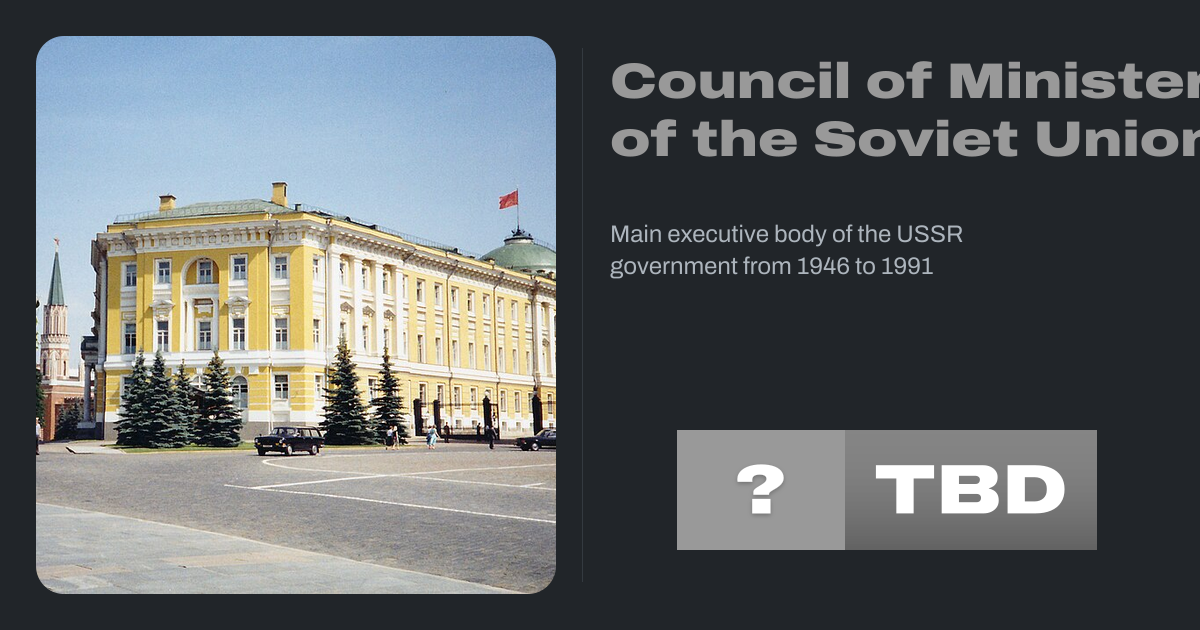 The Council of Ministers of the Union of Soviet Socialist Republics (Russian: Совет министров СССР, tr. Sovet Ministrov SSSR, IPA: [sɐˈvʲet mʲɪˈnʲistrəf ɛsɛsɛˈsɛr]; sometimes abbreviated to Sovmin or referred to as the Soviet of Ministers), was the de jure government of the Union of Soviet Socialist Republics (USSR), comprising the main...
