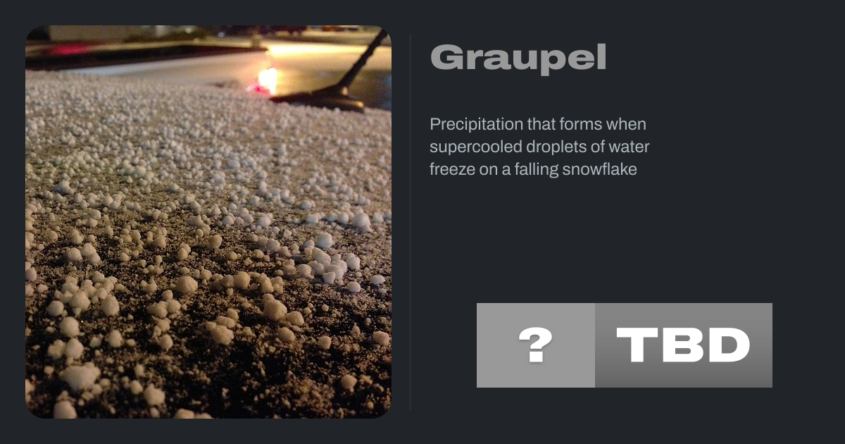 Graupel (; German: [ˈɡʁaʊpl̩] ), also called soft hail or hominy snow or granular snow or snow pellets or popcorn snow, is precipitation that forms when supercooled water droplets in air are collected and freeze on falling snowflakes, forming 2–5 mm (0.08–0.20 in) balls of crisp, opaque rime.