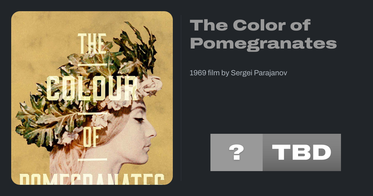 The Color of Pomegranates, originally known as Sayat-Nova, is a 1969 Soviet Armenian avant-garde film written and directed by Sergei Parajanov. The film is a poetic treatment of the life of 18th-century Armenian poet and troubadour Sayat-Nova. The film is regarded as a landmark in cinema history, and was met with widespread acclaim among...
