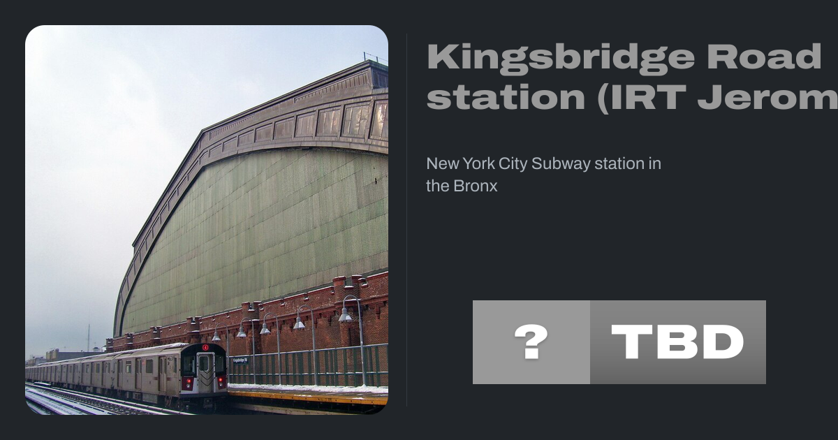 The Kingsbridge Road station is a local station on the elevated IRT Jerome Avenue Line of the New York City Subway. Located at the intersection of Kingsbridge Road and Jerome Avenue in the Kingsbridge Heights neighborhood of the Bronx, it is served by the 4 train at all times. The station is adjacent to the Kingsbridge Armory. It was constructed...