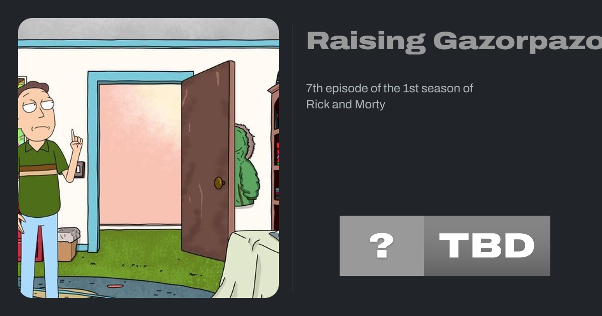 "Raising Gazorpazorp" is the seventh episode of the first season of the American television series Rick and Morty. It was directed by Jeff Myers and written by Eric Acosta and Wade Randolph, and aired on March 10, 2014. The episode has received mixed reviews from critics. The title of the episode is a play on words to the film Raising Arizona...